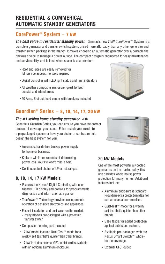 You can buy a Generac portable or standby generator at half the price of the competitions’ gensets. Despite being cheaper than its competitors, a Generac generator for residential use is designed to last long. ... Document Viewer